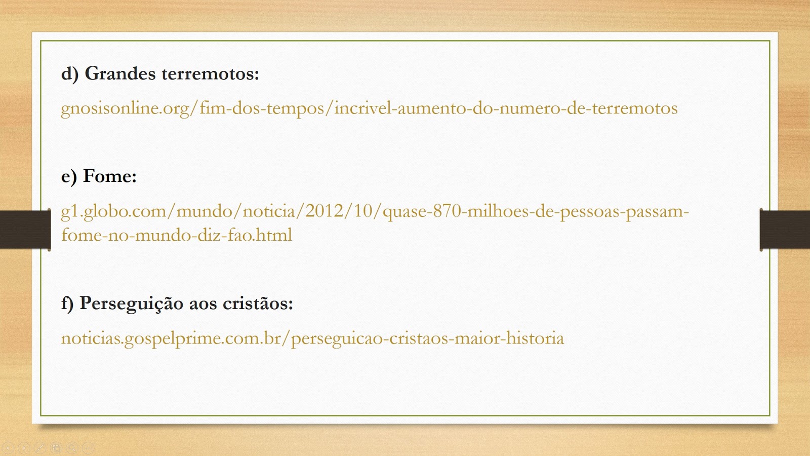 ResponderExcluirNão tenho como precisar esse número, mas as que ainda faltam para se cumprir até a volta de Jesus eu abordo ao longo desses slides mesmo, na parte "tribulacionista".